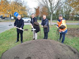 Traditioneller Spatenstich: v.l.n.r. Frank Wrba vom Planungsbüro WSE Wrba Systemtechnik Eisleben GmbH, Kreistagsmitglied Matthias Egert, Landrat Andy Grabner, René Kallenbach vom Unternehmen BAUER Spezialtiefbau GmbH aus Nordhausen