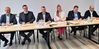 Gemeinsam sind wir stark. Die Stadt- und Gemeindeoberhäupter bei der Unterzeichnung der Vereinbarung. V.l.n.r. Armin Schenk, Oberbürgermeister Bitterfeld-Wolfen; Mathias Egert, Bürgermeister Zörbig; Ferid Giebler, Bürgermeister Muldestausee; Steffi Syska, Bürgermeisterin Sandersdorf-Brehna, Hannes Loth, Bürgermeister Raguhn-Jeßnitz und Thomas Schneider, Bürgermeister Südliches Anhalt