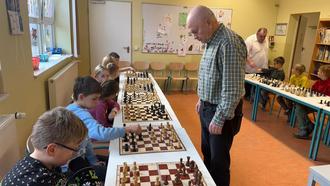 Gerhard Köhler beim Simultan-Schach gegen Schülerinnen und Schüler der Hermann-Conradi-Grundschule Raguhn-Jeßnitz.