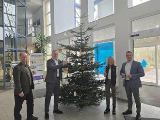 Gemeinsam mit Ortsgruppenleiterin Marleen Hielscher und dem Vorsitzenden des Naturparks Dübener Heide, Axel Mitzka schmückten Umweltdezernent Andreas Rößler und Landrat Andy Grabner den Weihnachtsbaum im Foyer der Kreisverwaltung mit selbstgebastelten Kunstwerken der Grundschüler der Naturparkschule Rösa. Die gemeinsame Aufstellung des Weihnachtsbaums aus der Dübener Heide ist eine liebgewonnene Tradition in der Adventszeit.