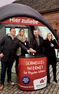 Startschuss für die Inbetriebnahme des Breitbandnetzes in Raguhn-Jeßnitz: v.l.n.r.: Nils Naumann, Vorsitzender des Stadtrates Raguhn-Jeßnitz,; Edda Römmling, Stadtverwaltung Raguhn-Jeßnitz; Landrat Andy Grabner und Sabrina-Maria Geißler, Geschäftsführerin der wittenberg-net GmbH