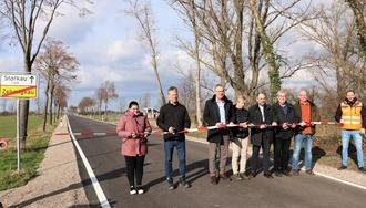 Gemeinsam schneiden Vertreter des Landkreises, der Kommune und der Baufirma das Band für die offizielle Straßenfreigabe durch.