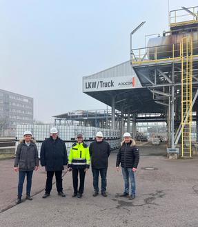 Werksrundgang bei der ADDCON GmbH (v.r.n.l.): Landrat Andy Grabner, Jens Michel (Betriebsleiter), Victoria Rosenau (Head of Compliance), Nikolaus Jungbluth (Business Unit Director FEED) und Mittelstandsbeauftragter Daniel Krake