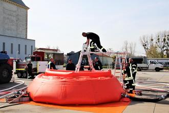 Einsatzkräfte bauen eine mobile Löschwasserstation auf, die ein Fassungsvermögen von 15.000 Liter hat..