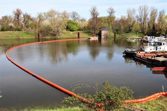 Die Einsatzkräfte üben die Errichtung einer Ölsperre.