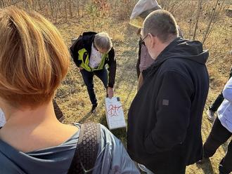 Ein Stück weiter, am Übergang vom Bitterfelder Stadtwald zum Goitzschewald, erinnern nur noch einzelne Wildrosen an das „Rosa Eck“. Zu diesem Areal gehören auch „Lucretius Place“, „Götter im Exil“, der Schmetterlingspfad und das „Irisfels mit Schwellen“ fasst Klaus-Peter Jaskulsky zusammen, der als Mitglied des bis 2019 tätigen „Fördervereins Goitzsche“ etliche Stunden in der Landschaft und mit der Landschaftskunst verbrachte. Viele Erinnerungen teilte er, ebenso wie Heike Brücker, Landschaftsarchitektin der Stiftung Bauhaus Dessau, die Anfang der 2000er zur Arbeitsgruppe um den französischen Künstler Jaques Leenhardt gehört und im Goitzschwald künstlerisch tätig wurde.