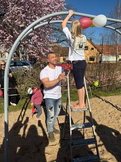 Arbeitseinsatz am Klettergerüst - gemeinsam mit Hanna verpasst Landrat Andy Grabner dem Spielgerät einen neuen Anstrich.