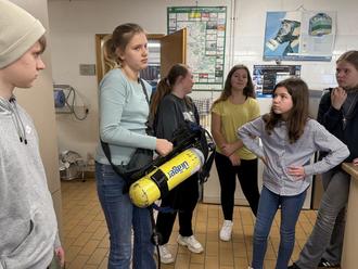 Die Jugendlichen testeten, wie schwer eine Atemschutzflasche ist.