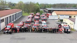 Die Einsatzkräfte und Fahrzeuge des Löschverbandes Ost auf dem Gelände des Fachbereiches Brand-, Katastrophenschutz und Rettungsdienst in Bitterfeld.