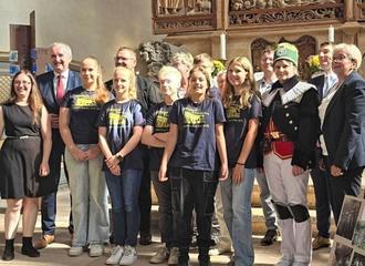 Rötha, 8. September 2024: Die Oberschule Brand-Erbisdorf erhält den Sächsichen Kinderjugenddenkmalpreis 2024. Auch Staatsminister Thomas Schmidt (2. v. l.) ist von der Präsentation beeindruckt (Foto: Zoltán Kilian).