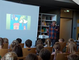 In einer interaktiven Leseveranstaltung stellte uns der Kinderbuchautor Frank Kreisler in der Bibliothek sein Buch „Der Bücherdieb im Süßen Drops“ vor. In einer kindgerechten, spannenden Dreiviertelstunde, bei der er viel die Kinder einbezog, steigerte sich die Spannung und die Kinder wollten wissen, ob es dem kleinen Nachtgespenst gelingen würde, sein Buch zu Ende zu lesen. Zum Schluss konnten viele ein Buch mit persönlicher Widmung mitnehmen, was manche gleich im Hort weiterlasen.