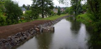 Im Landschaftspark Niederes Rittergut Langenau (25) fanden im Februar Gehölzpflege- und Fällarbeiten statt und im September wurde mit der Maßnahme (26) "Gewässerrevitalisierung oberer Parkteich" begonnen. Hier wurde bis zum Wintereinbruch die Schlammauflage beräumt und mit der Abdichtung des Damms begonnen. Die Arbeiten am dortigen Auslaufbauwerk sind fast abgeschlossen. (27) Im Stadtgebiet wurden vom städtischen Bauhof mehrere neue Holzbänke aufgestellt. (28) Das Hochwasserschutzkonzept Oberreichenbach konnte nun planerisch fertiggestellt werden. Es wurde mit dem digitalen städtischen Baumkataster (29) begonnen sowie die Bürgerbeteiligung zur Lärmaktionsplanung (30) durchgeführt. Der städtische Bauhof richtete eine (31) Aufstellfläche für Wertstoffscontainer entlang der August-Bebel-Straße/Ecke Untere Dorfstraße ein. Durch ihn wurden weiter zahlreiche Arbeiten im Bereich Gewässerunterhaltung, Grünpflege, Unkrautbekämpfung, Baumpflege, Spielplatz- und Parkplatzinstandhaltung ausgeführt (32).