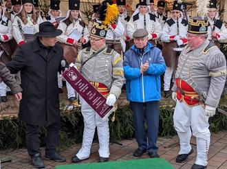 Ein Fahnenband als Dankeschön an das Musikkorps der Stadt Olbernhau für viele Jahre begeisternder Blasmusik zu unserem Stollenmarkt. Im Bild von rechts: Oberbergmusikmeister Kaltofen, Herr Fischer als Ehrenvorsitzender des Stadtvereins, Herr Brückner als Vorsitzender des Saigerhüttenvereins Olbernhau-Grünthal und OB Antonow (Foto: Dr. H. Walther).