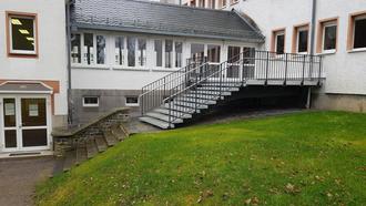 Oberschule BED: Erneuerung der Rettungstreppe zur Hofseite. Parallel wurde der Bereich unter der Treppe bis zur Turnhallentür trocken gelegt. Blitzschutz und Entwässerung sind auch erneuert worden.