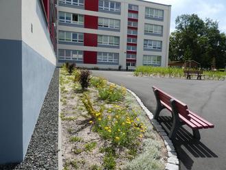 Fertigstellung 2.BA der Außenanlage Grundschule (Ende Mai 2024) - Neugestaltung des gesamten Innenhofes mit Pflanzinseln und Baumpflanzungen, Anlage Amphitheater, Ausstattung mit Bänken.