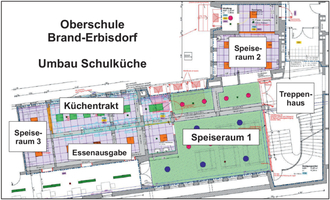 Neue Raumstruktur im Untergeschoss der Oberschule Brand-Erbisdorf: die Schulspeisung wird getrennt von Flucht- und Rettungswegen/Treppenhaus! Vor der Küchen-“Zeile“ gibt es die Essenausgabe samt Wartezone. Bis zu drei Speiseräume schaffen Individualität und geben notwendige Ruhe. Gläserne Trennwände sind Sichtachse und Windfang zugleich (Entwurf: Planungsbüro Mann & Pitzler, BED).