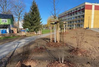 Bis Mitte März wurden 138 Sträucher und 39 Hochstämme gepflanzt und fachmännisch mit Dreibock versehen: Baumhasel, Feldahorn, Grau-Erle, Rot-Eiche (auch Amerikanische Spitzeiche genannt), Mehlbeere, der Prächtige Trompetenbaum, Schwarzer Tupelobaum, Spitzahorn, Vogelkirsche und Winter-Linde. Bis Ende April sollen es insgesamt 50 neue Bäume und reichlich 180 neue Sträucher (Felsenbirne, Kornelkirsche, Hartriegel, Haselnuss, Holunder und Schlehe, versch. Wildrosenarten, Pimpernuss, zwei Schneeballarten u.a.m.) sowie zahlreiche Stauden (bspw. Brandkraut, Elfenblume, Storchschnabel) werden. Flächen mit Wildblumenansaat sind angelegt; frische Rasenansaat säumt die Wege.