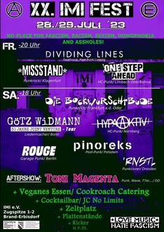Man könnte die zweitägige Veranstaltung als Vereinsfeier betrachten, jedoch nicht rein für Mitglieder, sondern für alle Menschen die Lust haben, organisiert. Auch während der vergangenen Pandemie konnte das Open-Air dreimal unter notwendigen Auflagen durchgeführt werden. Und genau deshalb feiern wir 2023: Zwanzig Jahre IMI-Fest. Zwanzig Jahre Ehrenamt, Subkultur, Vielfalt, Emanzipation und Partizipation. Eine Zeit, in der Bands und Künstler*innen nicht nur einmal gesagt haben: „Brand- Was? Erbisdorf? Noch nie davon gehört!“. Viele von jenen Unwissenden machen sich nun jedes Jahr ein Kreuz in den Kalender, wenn es wieder heißt, die Zugspitze in Brand-Erbisdorf feiert. Und so entstanden Bekanntschaften und Freundschaften, auch über Bundesgrenzen hinaus. Für alle die sich die letzten zwei Jahrzehnte nicht hochgetraut haben, keine Zeit hatten oder gar nicht wussten, dass es uns gibt: Ihr seid herzlich eingeladen mit uns zu feiern!
