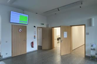 Besucherfreundlich ist der Bereich barrierefrei (Fahrstuhl auf der Rückseite des Gebäudes) erreichbar. Im Eingangsbereich des Foyes ist die Zimmerverteilung ersichtlich, ein kleiner Besucherbereich ist bestuhlt und ein Terminal zeigt die jeweilige Verfügbarkeit der dortigen Ämter und Sachgebiete zu den Öffnungszeiten an. Und natürlich stehen Ihnen die Bediensteten der Stadtverwaltung weiterhin zur Verfügung, einfach bitte fragen! Terminvereinbarungen gern über QR-Code.