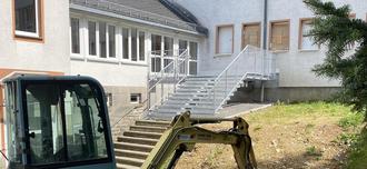 Im Rahmen des Brandschutzkonzeptes des Schulgebäudes war die Erneuerung der Fluchttreppe in der Oberschule (Hofseite) zwingend, da die alte Treppe aufgrund des Bauzustandes gesperrt war. Gleichzeitig zu dieser Maßnahme erfolgte die Trockenlegung der Außenwände im dortigen Bereich. Beide Maßnahmen schlagen laut Plan mit insgesamt 60T€ zu Buche.