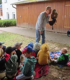 Bei strahlendem Sonnenschein besuchten die Kinder in der dritten Ferienwoche König Neptun aus der Tiefsee. In einer kleinen „Unterwasserwelt“ wurde jedes Kind mit einem Spruch unter seinen Fischflossen getauft. Das sonnige und heiße Wetter lud die Kinder auch in der vierten und fünften Ferienwoche zu jeder Menge Badespaß ein. Dabei sorgten Wasserspritzpistolen, eine Dusche und unser Wellenspieler für Spaß bei Groß und Klein. Als Überraschung gab es für die Krippen- und Kindergartenkinder ein leckeres Eis, welches gemütlich im Schatten vernascht wurde. Der Frühdienst und das Frühstück wurden bei diesem herrlichen Wetter nach draußen verlegt und kam bei den Kindern und Eltern sehr gut an. An der frischen Luft schmeckt es bekanntlich am besten. Ein weiteres Highlight war der Besuch der Wildvogelpflege Mittelsachsen. Die Kinder staunten über die mitgebrachten Falken, Eulen und Uhus und ganz Mutige durften diese auch auf dem Arm halten und streicheln.