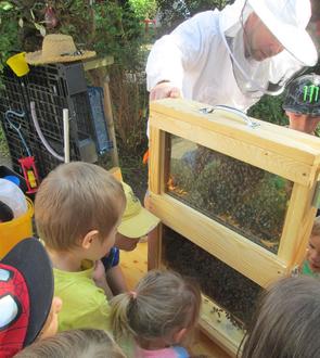 Im August besuchte uns dann der Imker, Herr Espig, welcher den Kindern seinen kleinen Bienenstock mit der Bienenkönigin gezeigt hat. Ganz aufmerksam wurde das Stück einer akkurat gebauten Honigwabe von den Kindern betrachtet und den Berichten über das Leben und Arbeiten der Bienen gelauscht.