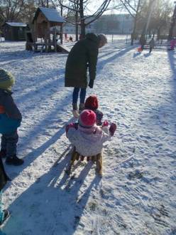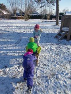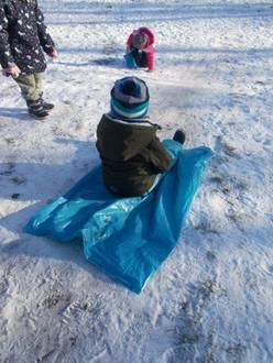 Juhuuuuuuu ... was für ein Spaß in der Kita „Spatzennest“ ... endlich hat es geschneit und wir können mit Tüten und Schlitten durch unseren Garten rodeln.
