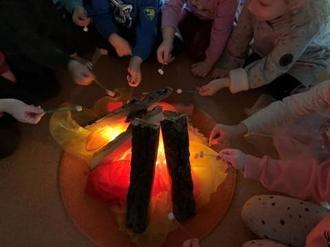 Die Bienchengruppe beschäftigte sich neben dem Erlernen der Notrufnummer und den Fragen: „Was löscht ein Feuer?“ und „Was braucht die Feuerwehr, um ein Feuer zu löschen?“ mit dem Element Feuer an sich. Dazu wurde ein „Lagerfeuer“ gestaltet, an dem die Kinder Marshmallows „rösten“ konnten und ein Pustebild wurde davon erstellt. Zudem wurde das Thema Feuer bildlich und verbal mit Hilfe des Erzähltheaters Kamishibai dargestellt. Die Bienchen haben mehrmals einen Feueralarm geprobt und schließlich die Ergebnisse der Woche auf einem großen Plakat zusammen gefasst.
