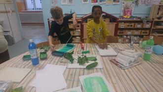 Zudem erhielten sie einen ersten Einblick in verschiedene Drucktechniken der Monotypie. Einmal wurden abstrakte Bilder mit Fadentechnik von einer Glasscheibe abgedruckt. Bei einem anderen Experiment wurden Druckplatten aus Gelatine hergestellt und Abzüge von Pflanzen aus unserem Hortgarten erstellt.