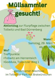 Ist dir/Ihnen auch schon aufgefallen, dass am Wegesrand oder neben vollen Mülleimern oftmals Abfall auf dem Boden liegt? Der herumliegende Müll sieht nicht nur unschön aus, er ist auch schlecht für die Umwelt. Wir möchten uns gegen die Vermüllung einsetzen und laden Euch ein, mitzumachen. Am 29.März 2025 um 10 Uhr starten wir in zwei Gruppen – am Herrenteich in Tollwitz und in Goddula am Beginn des Tollwitzer Weges. Wir treffen uns mit dann „gefüllten Müllbeuteln“ mittig der Wege mit einem Dankeschön bei Bratwurst und Grillkäse.