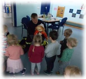 Ebenso konnten wir ein tolles Steckerspiel ausprobieren, natürlich ging es hier um die Feuerwehr. Wie sieht ein Auto aus? Wo befindet sich die Leiter? Welche Farbe hat das Licht auf dem Feuerwehrauto? Wir hatten sogar die Möglichkeit, eine richtige Feuerwehrjacke anzuziehen und den Helm aufzusetzen. Er zeigte uns die richtige Feuerwehrkleidung, aber auch Sachen der Kinderfeuerwehr. Spannend war auch zusehen, wie stabil die Schuhe eines Feuerwehrmannes sind und was sie alles aushalten können, ohne dass der Fuß verletzt wird. Zum Abschluss durften wir eine Handpuppe kennenlernen, die bei der Kinderfeuerwehr immer mit dabei ist. Diese fanden wir echt lustig, sie wusste aber auch viel über die Feuerwehr.