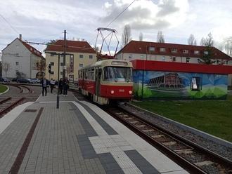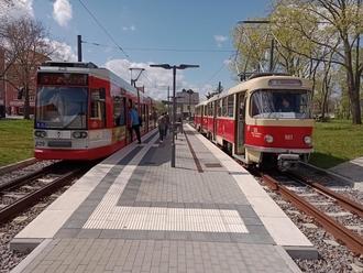 Zwei Fahrzeuggenerationen: Links der DUEWAG-Niederflurwagen vom Typ MGT6D (die Serie wurde zwischen 1996 und 2001 gebaut) und rechts der TATRA-Zug vom Typ T4D/B4D. Der Beiwagen wurde bereits 1967 bei ČKD Prag gebaut und in Belgrad erprobt.