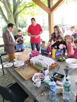 Die Sonne meinte es gut und alle waren mit Begeisterung dabei. Nach ca. 2 h war die Arbeit getan und der Ortsbürgermeister nebst seiner Frau hatte schon für alle lecker Roster, Steak und Nudelsalat bereitgestellt. So konnten alle Teilnehmer bei einem netten Gespräch essen und trinken.