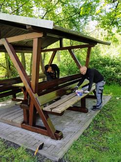 Dann wurde Farbe und Pinsel verteilt und die Bänke mussten vor dem Streichen noch geschliffen werden. Kinder und deren Eltern sammelten im und um den Ort (leider) reichlich Müll. Die Feuerwehr reinigte die Bushaltestellen und versuchte das Graffiti-Geschmiere zu beseitigen.