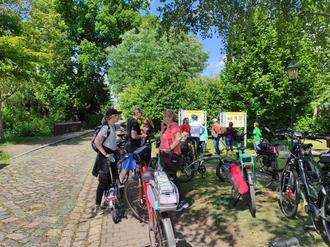 Nachdem im Persebach drei Stunden mit den Flößern das Weltkulturerbe gepflegt wurde ging es los.Vom Saalefahrradweg am Rehagehege sind wir auf dem Kohle Weg Richtung Tollwitz abgebogen.Am Keuschberger haben wir den Biber beobachtet.Schön,dass hier unser Naturlehrpfad vom NABU fortgesetzt wird.Wir sind weiter am Persebach bis Zöllschen gefahren.Hier kreuzten wir den Elsterflossgraben.Der alte Feldweg diente der Fahrradguppe ohne Gefahr über den Oetzscher Weg nach Nempitz zu kommen.Hier konnten die Kinder ausruhen und die Schautafeln am Flossgraben lesen.Von Nempitz ging es dann immer am Flossgrabenfahradweg lang.Die Runde freute sich dann,dass sie in Koetzschau beim Heimatfest empfangen genommen wurde.