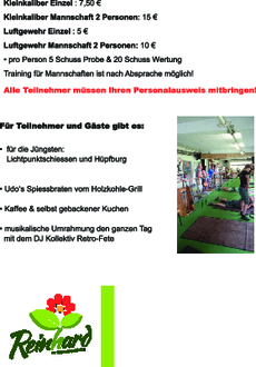 Zeigen Sie Ihr Geschick mit dem Kleinkaliber Gewehr liegend auf 50m oder dem Luftgewehr stehend auf 10m. Treten Sie entweder in der Einzelwertung an oder bilden Sie mit einem Freund oder Familienmitglied ein unschlagbares Team in der Mannschaftswertung (2 Personen). Denken Sie bitte daran, Ihren gültigen Personalausweis mitzubringen, da dieser zwingend erforderlich ist.