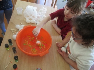 Zu Ostern hatten wir wieder viel geplant. Schon einige Zeit vorher, wurden die Kinder durch Bilderbücher, Basteleien, Lieder und Gespräche auf die Osterzeit vorbereitet. In der Osterwoche vom 27.03. – 31.03.2023 sind die Kinder auf einen Osterspaziergang gegangen, haben Ostereier bemalt und ein Osterbrot, sowie einen Osterkuchen gebacken. Natürlich hat der Osterhase auch dieses Jahr wieder für jedes Kind ein Osterkörbchen im Garten versteckt.