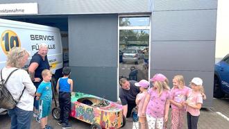 Mühsam zogen wir eine neu erworbene Seifenkiste, welche wir vorab von der „Fördergruppe Stiftung Samariterherberge“ geschenkt bekommen hatten, Richtung Kindergarten. Leider hatte die Kiste vier platte Reifen und das Schieben und Ziehen brachte uns ganz schön zum Schwitzen. Zum Glück führte unser Weg am Reinsch Autohaus vorbei, wo uns Herr Schwahn (Papa eines Vorschulspatzen) erblickte. Sofort bot er uns seine Hilfe an. Er pumpte nicht nur Luft in die Reifen, sondern fuhr uns die Seifenkiste mit seinem Arbeitsauto in die Kita.