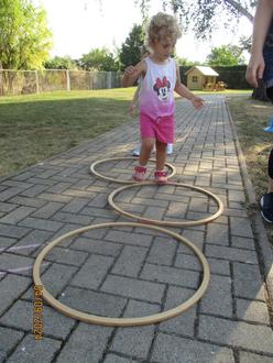 Es entstand ein kleiner Parcours, der mit Freude von den Kindern angenommen wurde. Erst balancierten wir über eine Bank, hüpften von Reifen zu Reifen und zum Schluss wurde ein Hindernis bewältigt. Das war ein Spaß, jedoch nicht so einfach. Hier war besonders das Gleichgewicht gefragt.