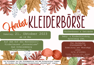 Wir freuen uns auf zahlreiche Verkäufer und Besucher im Montessori-Kinderhaus „Sonnenblume“ (Zschimmerstr. 12 a in Bad Schmiedeberg)!