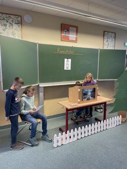 Die Kinder der 2. und 4. Klassen lasen sich gegenseitig selbst geschriebene Geschichten vor und führten kleine Theaterstücke auf. Grundlage dafür war „Die Anderen“ (Constanze Schargan), eine Begegnungsgeschichte zwischen Wildschweinen und Hausschweinen, die Vorurteile und Toleranz zum Thema hatte. Sie wurde den Kindern mithilfe des japanischen Papiertheaters „Kamishibai“ nähergebracht.