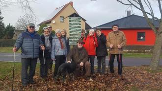 Ohne verschneite Landschaft, ohne Schneesturm, sondern bei freundlichem Wetter und einem Himmel in eleganten Grautönen wanderten wir am Ortsausgang hinaus in die Söllichauer Feldflur. Die Landschaft um unseren Heimatort trist und langweilig? Keinesfalls! Und was es da alles zu sehen gab. Große, mit Wintersaaten bestellte Ackerflächen wo wir, die etwas älteren Heidefreunde, noch wissen wie es aussah, als dort Wiesen einen offenen Wassergraben umsäumten. Der Wegweiser an der Wegegabelung in Richtung Hammermühle war das ideale Motiv für ein Gruppenfoto. Das war auch gleich die Gelegenheit für eine kurze Rast mit süßen und flüssigen Snacks aus verschiedenen Rucksäcken.