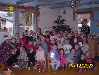 Am 19.12. starteten wir unsere Weihnachtsfeier mit einem ausgiebigen und leckeren Frühstücksbuffet. Ob Brötchen, Würstchen, Lebkuchen oder Plätzchen, für jedes Kind war etwas dabei. Anschließend schauten wir gespannt einem Puppenspiel zu, welches von zwei Erzieherinnen aus unserer Einrichtung vorgetragen wurde. Es handelte von Pitti und seinen verlorenen Wunschzetteln. Die Kinder sahen gespannt zu und freuten sich am Ende riesig, als die Wunschzettel wieder auftauchten. Nachdem das Puppenspiel zu Ende war, ertönte mehrfach eine Glocke und alle Kinder schauten neugierig zur Tür. „Wer das wohl ist?“ Na klar-der Weihnachtsmann. Er trat in den Raum und setzte sich vor unseren schönen buntgeschmückten Weihnachtsbaum. Da er leider nicht mit seinem Schlitten anreisen konnte, brachten seine Wichtel am Abend vorher die Geschenke vorbei und legten sie unter den Weihnachtsbaum. Für jedes Kind brachte der Weihnachtsmann noch eine Kleinigkeit mit und die Freude der Kinder war ihnen förmlich ins Gesicht geschrieben. Gemeinsam sangen wir noch Weihnachtslieder und verabschiedeten unseren Weihnachtsmann. Gemeinsam wurden dann die Geschenke ausgepackt. Natürlich wurden manche Spiele sofort ausprobiert und getestet. Alle Kinder bedanken sich herzlich beim Weihnachtsmann und wünschen sich das er im nächsten Jahr wieder zu uns kommt.