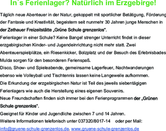 Ferienlager in einer Schule? Keine Bange! strenger Unterricht findet in dieser erzgebirgischen Kinder- und Jugendfreizeitstätte nicht mehr statt. Zwei Abenteuerspielplätze, ein Riesenkicker, Bolzplatz und der Besuch des Erlebnisbades Mulda sorgen für den besonderen Ferienspaß.