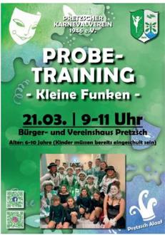 Der Pretzscher Karnevalverein 1946 e.V. lässt die Funken wieder sprühen und lädt alle kleinen Karnevalsfreunde herzlich zum Probetraining der „Kleinen Funken“ ein!