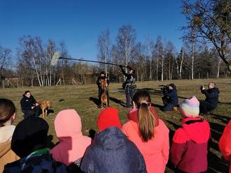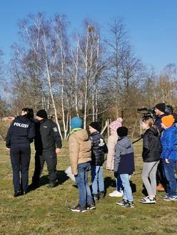 So fuhren wir am 1. März bei strahlendem Sonnenschein mit dem Bus nach Pretzsch. Unsere 4. Klasse wurde von vielen Zwei- und Vierbeinern in Empfang genommen. Frau Hillert, Polizeihauptkommissarin und amtierende Leiterin der Diensthundeführerschule, erklärte uns kurz die Regeln, damit die Hunde optimal arbeiten konnten. Wir gingen alle auf den großen Platz. Nachdem sich die Polizisten und ihre Vierbeiner vorgestellt hatten, begann die aufregende Polizeiarbeit. Zuerst durften Kinder von uns auf dem Gelände etwas verstecken, was „Käthe“ natürlich spielend fand. Leise applaudierten wir. Nun zeigten uns die Diensthundeführer, auf welche Kommandos ihre Hunde reagieren. Zum Schluss gab ein Kind ein Kleidungsstück ab. Eine Schülergruppe verließ nun den Platz, der Spürhund nahm die Fährte auf und fand genau dieses Kind in der Gruppe. Einfach beeindruckend!