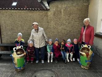Die Senioren der Tagespflege überraschten die Kinder aus dem Kindergarten „Teddybär“ in Pretzsch mit zwei großen Goldenen Monstern. Natürlich waren alle Kinder ganz neugierig und aufgeregt was das komisches ist.