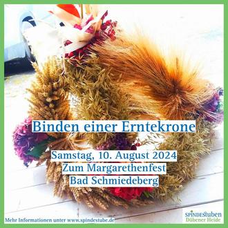 Im Rahmen des im August stattfindenden Margarethenfestes in Bad Schmiedeberg, wird sich auch der Spindestuben Dübener Heide e.V. den zahlreichen Bürgerinnen und Bürgern und zahlreichen Gästen präsentieren. Unter anderem werden wir erneut eine Erntekrone binden und die vorhandenen aufhübschen.