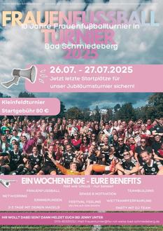 Zum zehnten Mal wird das beliebte Frauenfußballturnier des FSV Rot-Weiß Bad Schmiedeberg in diesem Sommer ausgetragen. Am Wochenende des 26. und 27. Juli 2025 verwandelt sich das Sportgelände in einen Ort voller sportlicher Highlights, emotionaler Erinnerungen und fröhlicher Begegnungen.
