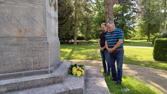 Schon wieder ist ein Jahr vergangen. Zum 100 jährigen Jubiläum war das Radfahrerdenkmal noch nicht restauriert. Trotz aller Bemühungen konnte mit den Restaurierungsarbeiten erst nach dem Jubiläum begonnen werden, inzwischen sind sie abgeschlossen. Auch die Miniaturen waren zu dieser Zeit noch nicht ausgestellt. Eine der beiden Miniaturen steht jetzt im Kneipp Therapiezentrum in einer Vitrine mit anderen Ausstellungsstücken. Die andere Miniatur steht im Friseursalon von Veit Baier und kann dort besichtigt werden. Ortsbürgermeister Heinz Stegert war es wichtig auch nach 101 Jahren der toten zu Gedenken und legte mit dem neu gewählten Stadtrat Veit Baier am Denkmal einen Blumenstrauß nieder.